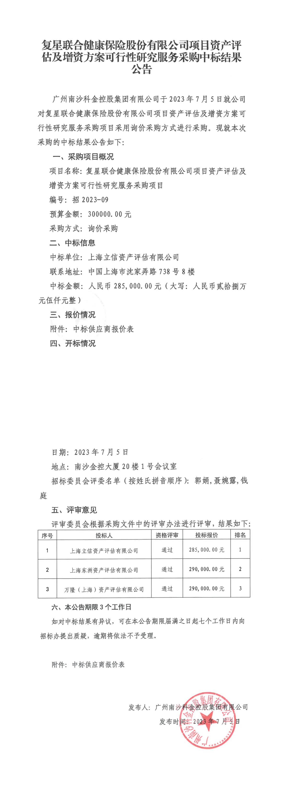 复星联合健康保险股份有限公司项目资产评估及增资方案可行性研究服务采购中标结果公告