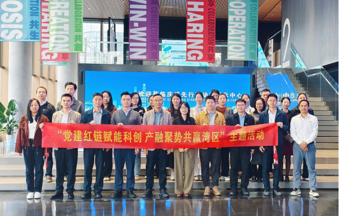全体人员首先前往位于《南沙方案》三大先行启动区之一——庆盛枢纽的香港科技大学(广州)科创成果转移转化基地参观学习。该基地依托香港科技大学及港科大(广州)双校一体化强大科创资源,致力于构建“科创成果+南沙转化+湾区应用”的完整科创产业生态链,积极推动优质港澳科技成果在南沙落地转化。党员们重点观摩了人工智能、新材料、生物医药等领域的多项前沿科研项目与成果展示,并就相关技术的市场化前景、初创企业融资需求等内容与基地人员展开交流。