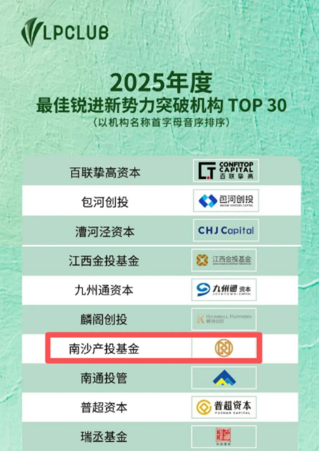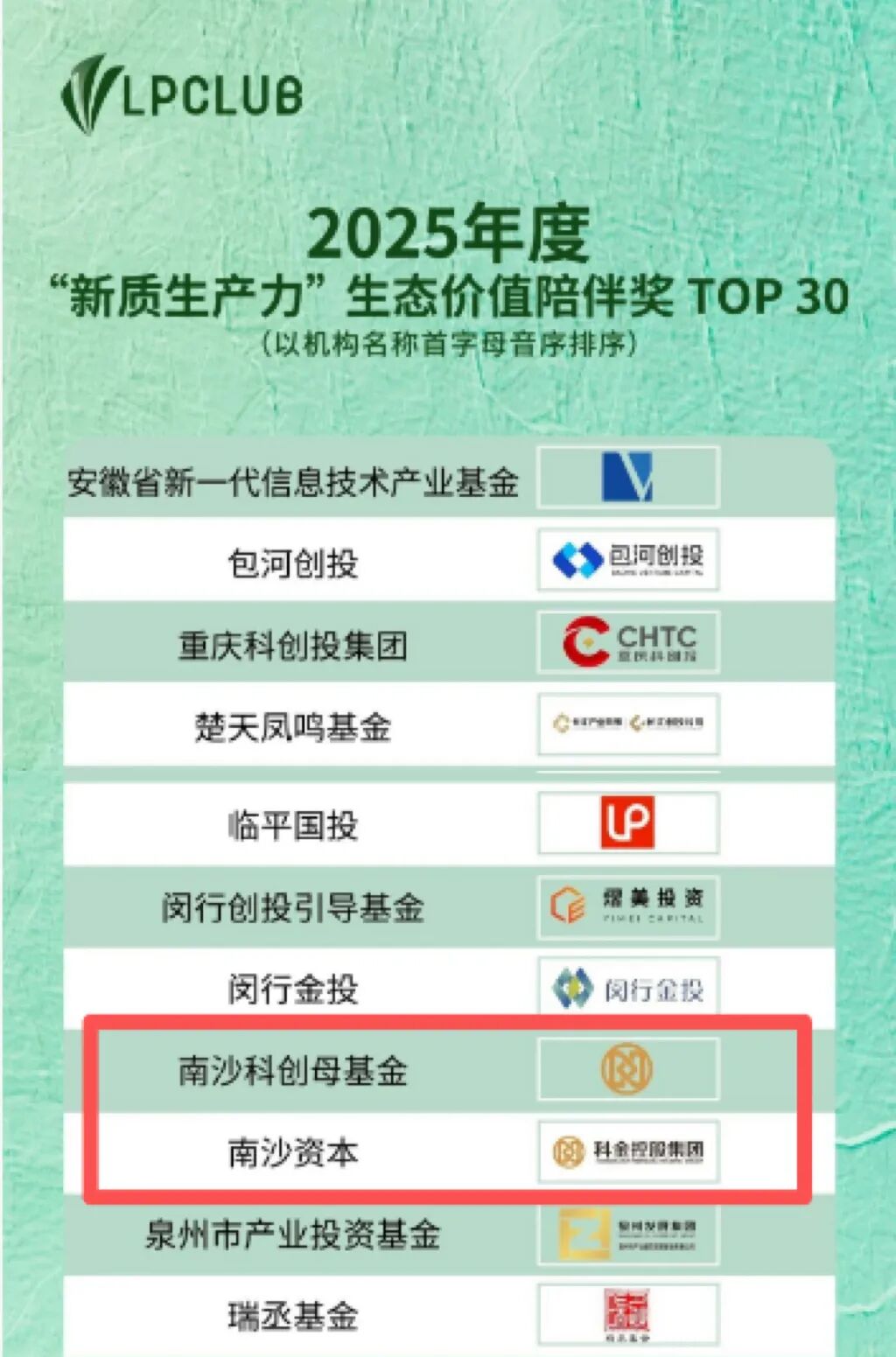 1月15日,LP CLUB榜·2025年度榜单重磅发布,备受业界关注。科金控股集团受托管理的广州南沙新区科技创新母基金(以下简称“南沙科创母基金”)荣获“2025年度‘新质生产力’生态价值陪伴奖TOP30”奖项,下属广州南沙产业创业投资基金管理有限公司(以下简称“南沙产投基金”)荣获“2025年度最佳锐进新势力突破机构TOP30”奖项、广州南沙资本投资有限公司(以下简称“南沙资本”)荣获“2025年度‘新质生产力’生态价值陪伴奖TOP30”奖项,南沙资本公司董事张博超荣获“2025年度私募股权投资意见领袖TOP50”。共同登榜的还有国科资本、上海科创集团、苏州天使母基金等知名投资机构。