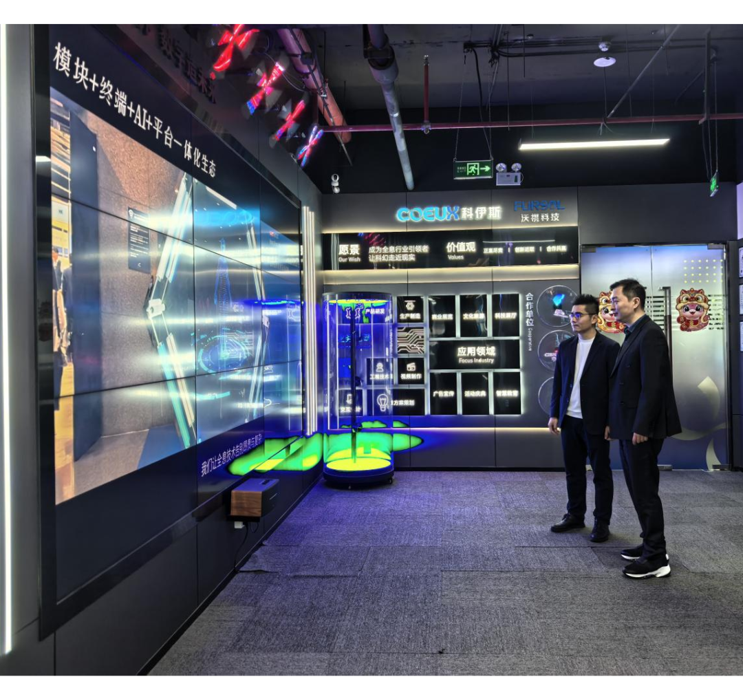 在科伊斯的展示中心,集团走访团队亲身体验了其无需辅助设备的裸眼全息3D显示效果。科伊斯负责人莫锦波介绍,作为国内实现轻量级全息显示技术规模化商用的探索者,科伊斯自2018年创立以来,已构建起“核心模块-智能终端-AI系统-生态运营”的一体化业务框架。