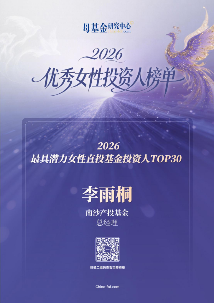 科金控股集团下属南沙产投基金公司总经理李雨桐荣获“2026最具潜力女性直投基金投资人TOP30”奖项,共同登榜的还有红杉中国合伙人公元等知名投资家。